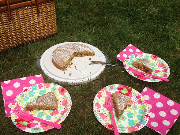 However, I have recently made a commitment to spending more time outside, whether it’s getting up from my desk and going for walks on my lunch break or hanging out more in my parents backyard on the weekends. That’s where I brought this cake today, and I set up this cute little scene above, complete with a picnic basket from the ’90s that my Mom dug out of the crawl space. I can’t say we actually sat on the grass and ate it, but I did eat it outside. It’s a start.