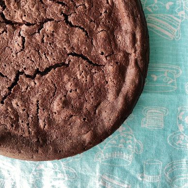 Besides all the eggs, there’s just a short ingredient list of chocolate, butter, sugar, vanilla and salt. It bakes up super puffy in the oven, but then deflates quite a bit, and once cooled has a nice fudgey texture and intense chocolate flavour.