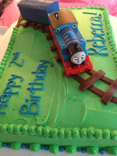 Unlike in the past where Google has provided lots of fun ideas and inspiration for everything from front-end loaders to princess castles, every Thomas related cake was either 3D or made out of fondant or looked super complicated. It was my friend Lydia (who herself made a Teenage Mutant Ninja Turtle cake for her little guy this year!) who had the idea of just doing a 9×13″ cake, with a little toy Thomas cruising over top. Genius!