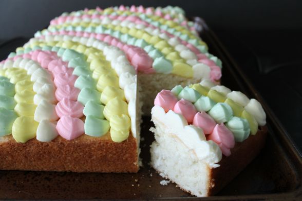 Robyn, this seriously looks PERFECT! I think your buttercream bursts look like delicious little marshmallows and I want to pick them off your cake… Well okay, I want the cake too. Your rainbow is just gorgeous!! I didn’t want to use up four piping bags (and I didn’t even think about the fact that I would have needed four same-sized tips), so I went with white. I do like this buttercream, but I agree that a little less butter would be a-okay. I know- props to the ladies making their own coconut extract!