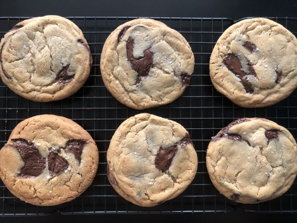 So what’s the verdict? Much like Christina Tosi’s Compost Cookies, these bake up to be very large, flat cookies, yet they aren’t crunchy at all. The large size gives you a crisp ring of cookie around the edge, but a soft chewy centre, with huge puddles of the most delicious (read: expensive) chocolate throughout. The aging process makes for an excruciating wait, but I wouldn’t skip it, as it enhances the flavour of the dough, giving it even more caramel undertones. These are definitely a special occasion/hoard them for yourself/share only with loved ones type of cookie, and they were worth absolutely worth the wait.